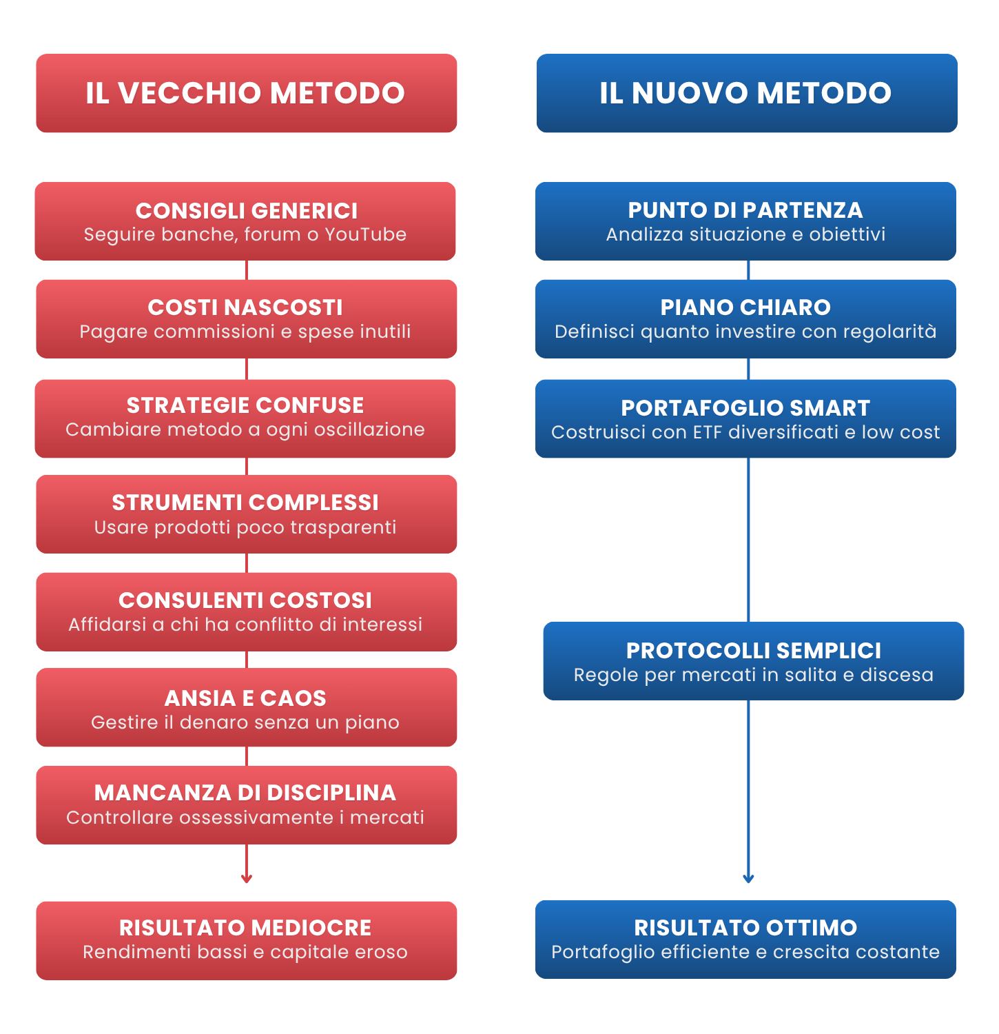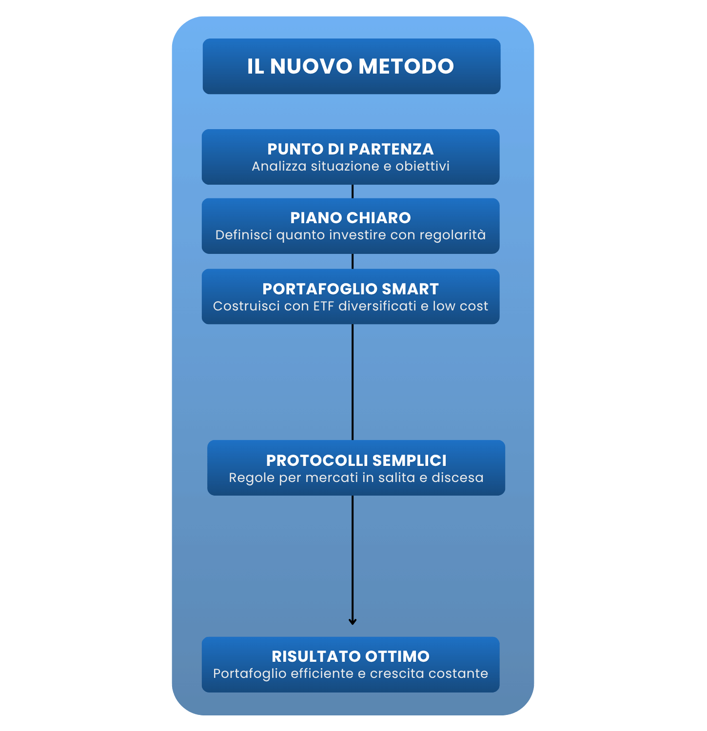 Faccio l’opposto: applico un metodo strutturato, con ETF efficienti, costi bassi e protocolli chiari per ogni fase del mercato.