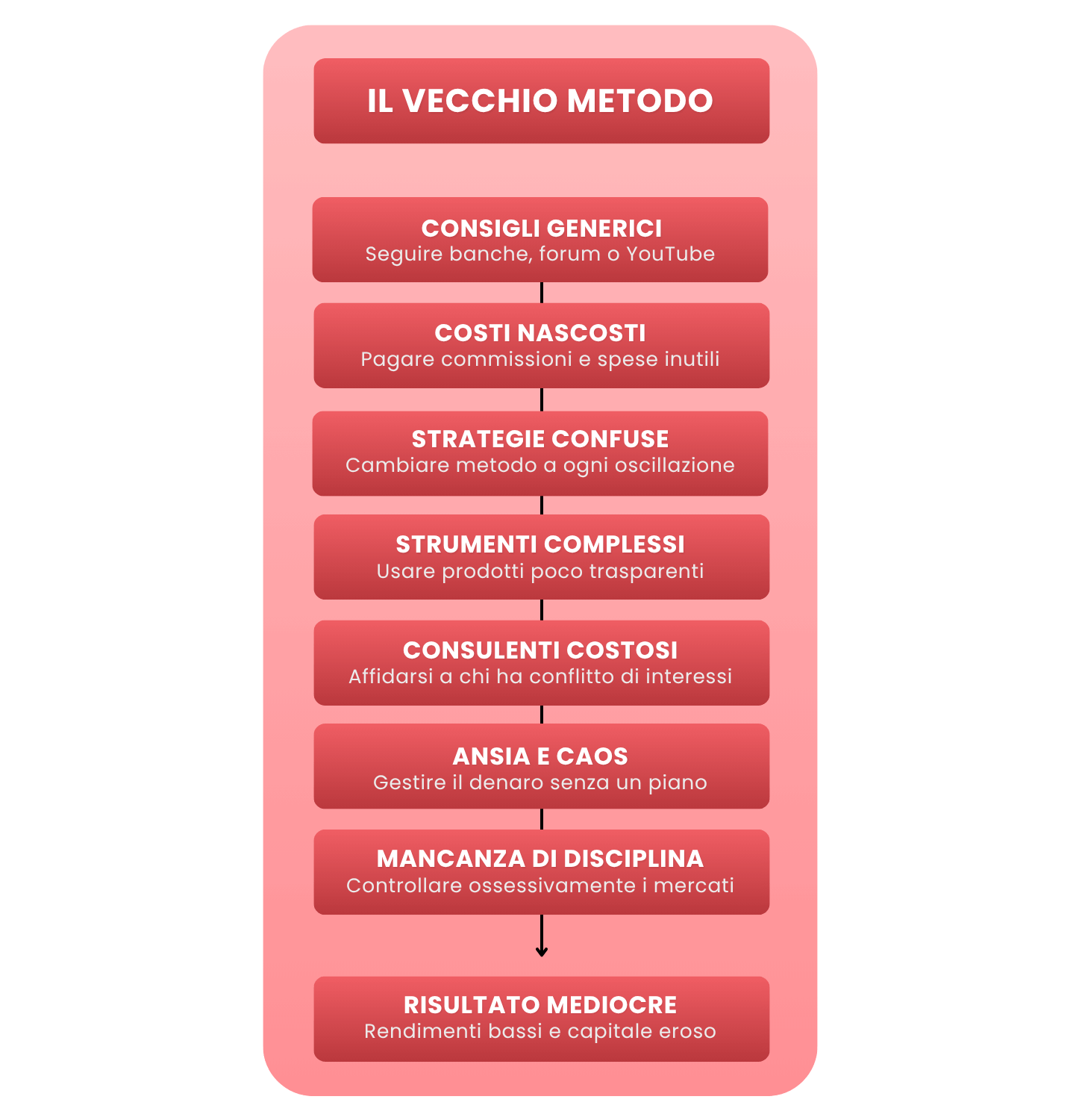 Continuavo a seguire i consigli delle banche senza risultati, provare corsi generici che non entravano mai nel dettaglio, investire in strumenti sbagliati, cambiare continuamente strategia e pagare commissioni che erodevano i miei risparmi.